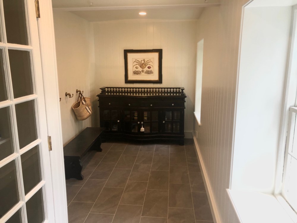 To prepare for the job and protect the newly completed renovations, we taped off and covered all flooring and furniture with tape, plastic, and drop cloths. The next step in preparation was priming the new drywall with Sherwin-William's Premium Wall and Wood primer, and filling nail holes. Following that, we sanded the ceiling, walls, and woodwork with 150 grit sandpaper. Next we caulked gaps in the woodwork and applied one coat of Zinsser Odorless Oil-based Primer to any bare wood. We then applied two coats of Sherwin-William's Emerald Water-based Urethane Semi-gloss Enamel matched to the shade of Benjamin Moore's Cotton Balls OC-122 to complete the woodwork. For the ceilings, we applied two coats of Sherwin-William's Pro Mar Ceiling Paint, and for the walls, two coats of Sherwin-William's Duration Interior Matte matched to Benjamin Moore's Swiss Coffee OC-45. This color is part of their Off-White Color collection, and a perfect choice for kitchen spaces, with its tranquil, sophisticated, and inviting feel.